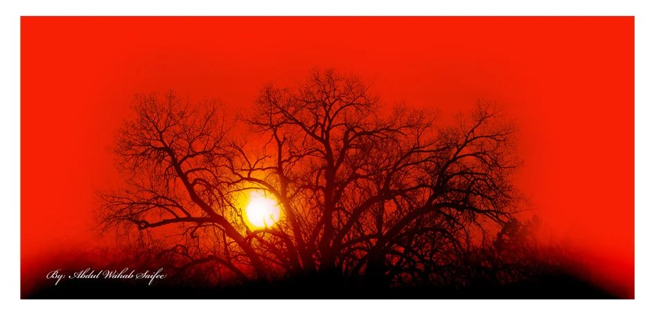 In the last light of day, the sun sought refuge in the heart of the tree—its branches like open hands holding a flame that would not burn, but bless. A stillness where fire met silence.